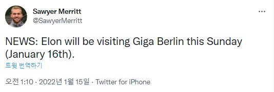1. 기가 베를린의 빠른 양산 시작을 촉구하기 위해서인지, 오픈에 앞선 방문인지는 확실하지 않지만 머스크가 주말 베를린을 방문할 예정입니다.